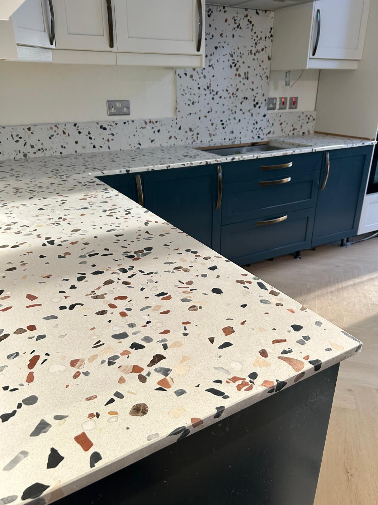 The terrazzo style high performance stone by Compac is a splendid addition to any kitchen, exuding a sense of timeless elegance and functionality. Designed with the highest quality materials and with a striking terrazzo aesthetic, it elevates the entire kitchen experience, making it not just another workspace, but also a space for inspiration and creativity. What truly sets it apart is its enhanced durability, resilience against heat, scratches, and staining, delivering the perfect balance in functionality and aesthetics which makes it more than just a modern kitchen choice but a remarkable investment.